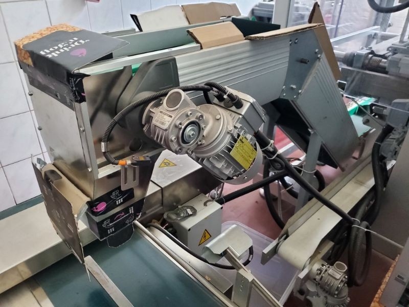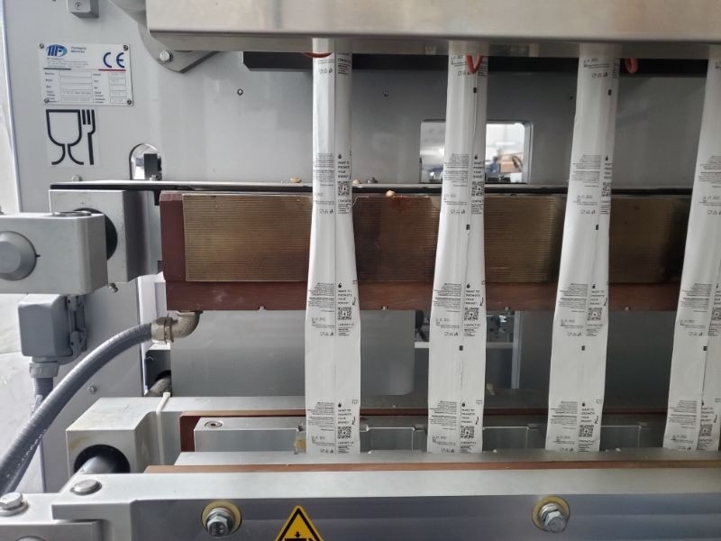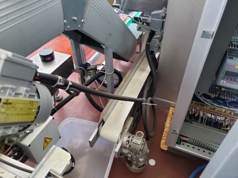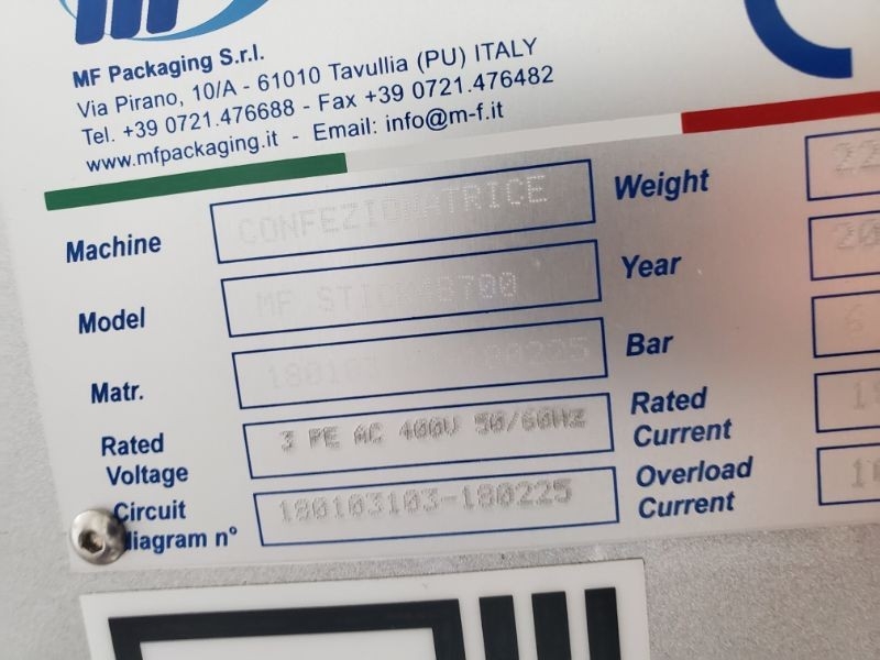 Capacity: 240 units per hour; Line parts:; MF Stick 4B700, ; Suction product loading device; Special shape adjustment; 4-lanes oscillating dosing system; Dosing unit device; Hopper; Vibrator; Dust extractor; Cartooning device; Tele assistance; Single head inject marker; Technical features:; N° of lanes: 4; Stick width: 60 mm; Max. reel width: 700mm; Max. production speed: 60 cycles/minute; Stick length: Min.50mm. Max. 150 mm; Electric tension: 400 volt 3 phase 50/60 hertz; Installed electric power: 15 kW; Compressed air consumption: 500 Nl/min; . Compressed air compression: 6/7 bar; Painted frame: RAL 9006; |