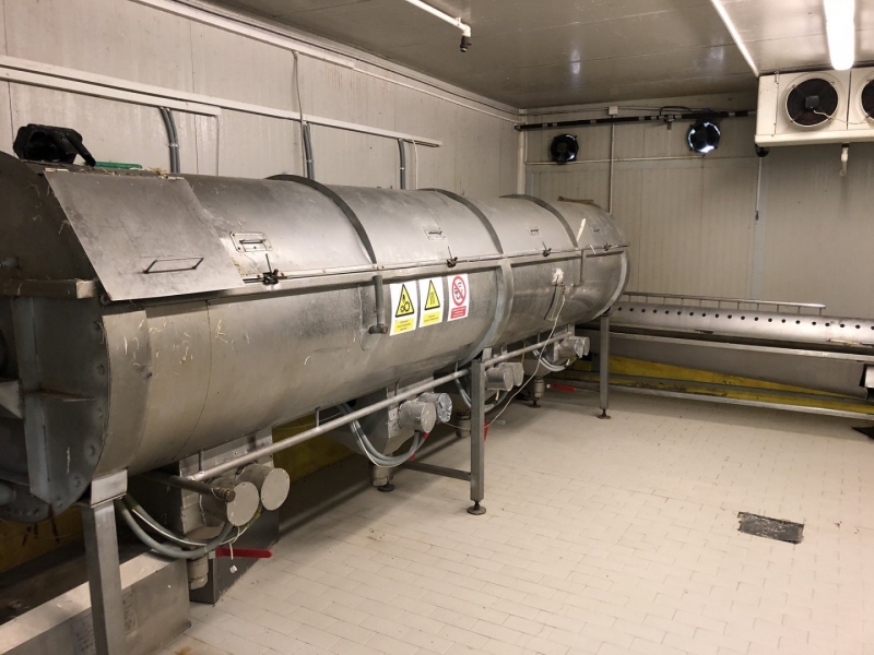 Capacity 1t/1h; stainless steel; approximately weight 1,5t-2t; first part length 6m height 1,8m; have two cabinet with electrical devices for speed and water heating power control .engine 1,5kw ; second part is pealing tube with 5,5kw engine with speed control length 3,2m height 0,8m;